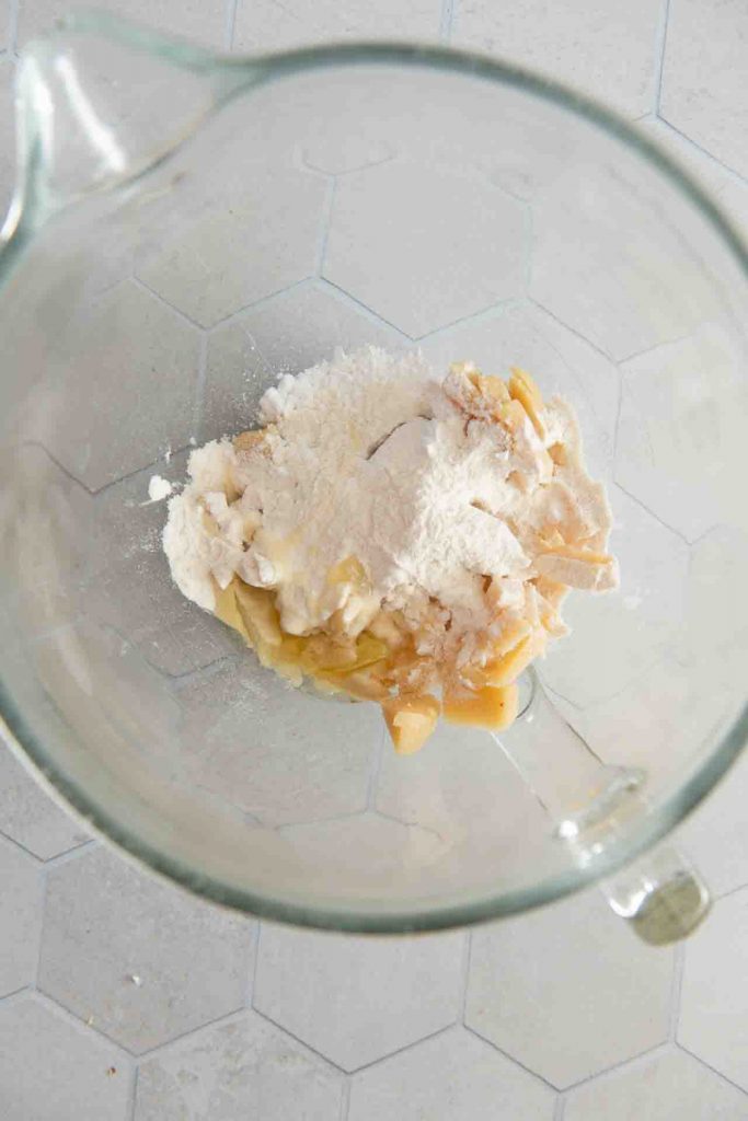 Heize den Backofen auf 170 °C Ober- und Unterhitze vor. Belege ein Backblech mit Backpapier. Hacke das Marzipan grob und gib es zusammen mit dem Puderzucker, 1 EL Mehl und dem Eiweiß in eine Rührschüssel.
