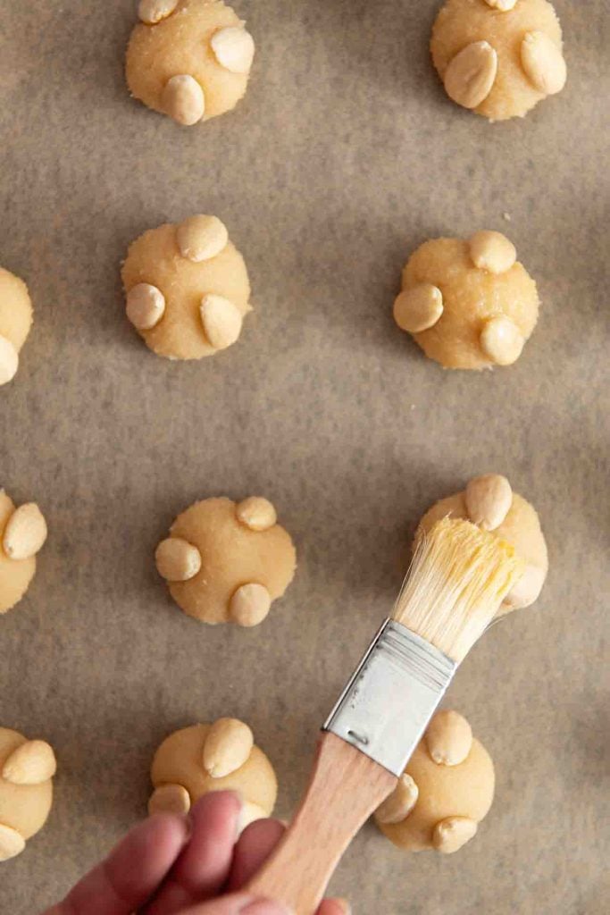 Vermenge das Eigelb mit Milch oder Wasser und bestreiche die Bethmännchen damit. Backe sie dann im vorgeheizten Backofen bei 170 °C Ober- und Unterhitze für ca. 15 Minuten bis sie eine hübsche, goldene Farbe haben.