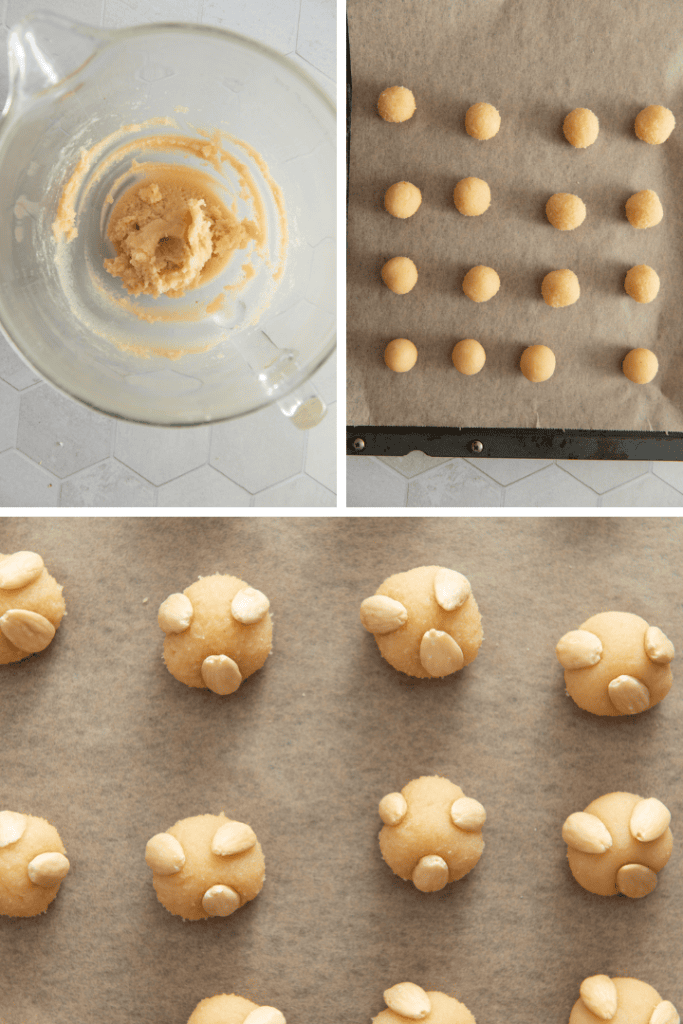 Vermenge die Zutaten zu einem glatten Teig. Forme aus dem Teig etwa Walnussgroße Bällchen und lege diese mit etwas Abstand auf das Backblech. Drücke je drei Nüsse an jeder Teigkugeln fest.