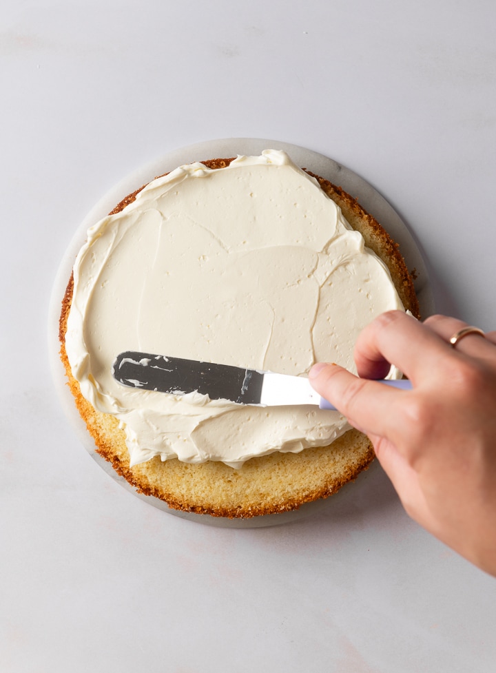 Lege den ersten Boden auf die Tortenplatte und gib eine etwa Tennisballgroße Menge Buttercreme auf den ersten Boden. Streiche die Buttercreme glatt und setze den nächsten Boden darauf. Verfahre so, bis alle Böden verbraucht sind.