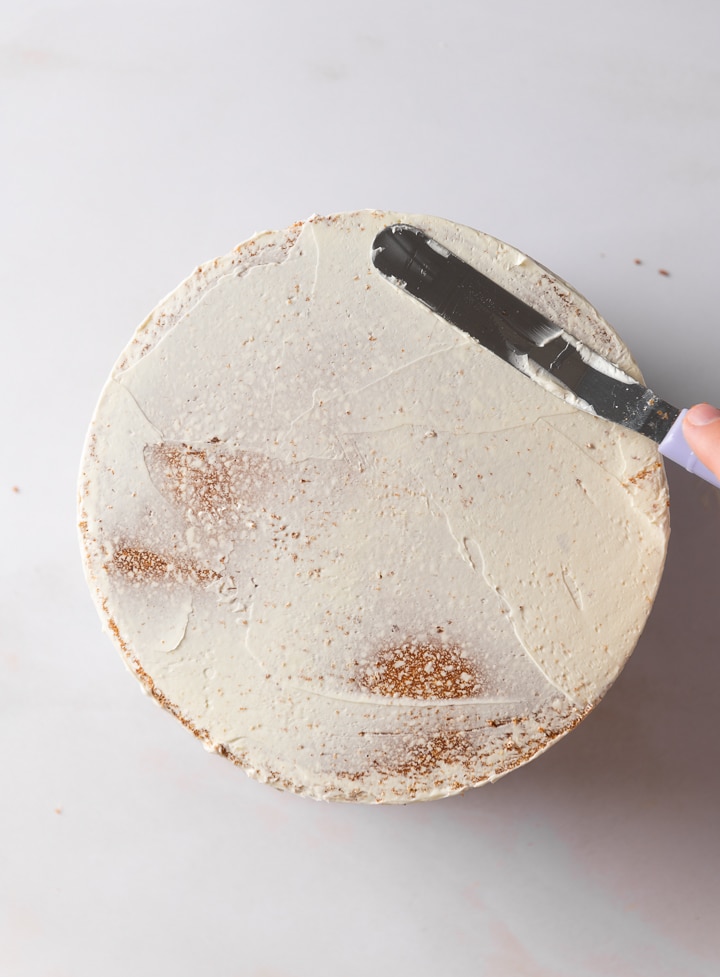 Streiche die Torte mit einer dünnen Schicht Buttercreme ein um alle Krümel einzuschließen und stelle die Torte für mindestens 30 Minuten in den Kühlschrank, damit die Krümelschicht fest werden kann.