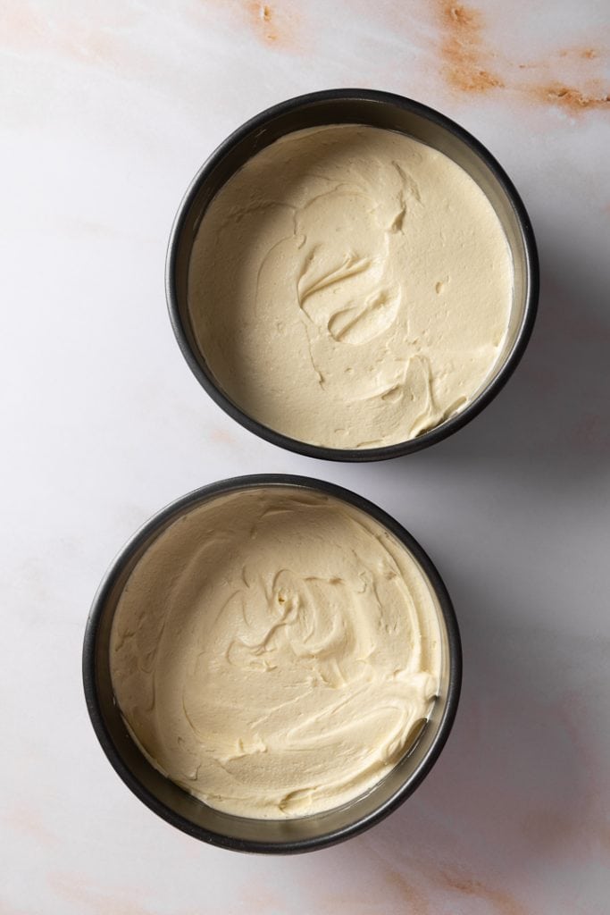 Heize den Backofen auf 170 °C Ober- und Unterhitze vor. Pinsle 2 runde Backformen mit 18 cm Durchmesser mit Butter aus und belege die Böden mit Backpapier.