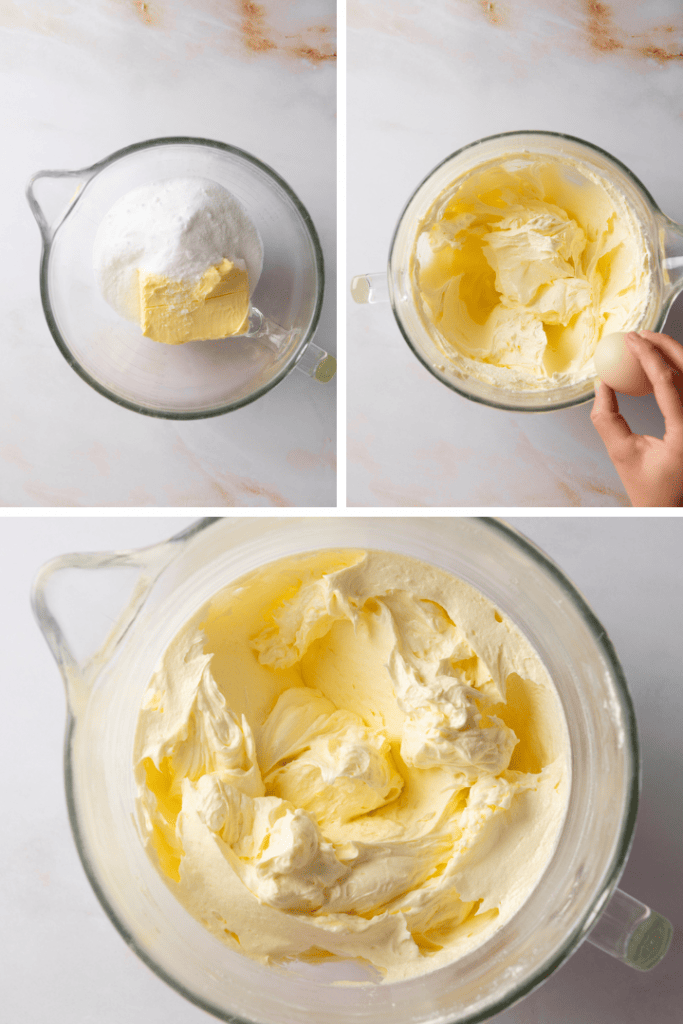 Gib Butter, Zucker und eine Prise Salz in eine große Rührschüssel und schlage sie mit der Küchenmaschine oder dem Handrührgerät so lange auf, bis sie hell und cremig sind. Füge nach und nach die Eier hinzu und rühre jedes Ei gründlich unter.