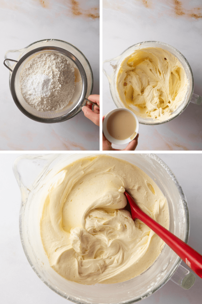 Siebe Weizenmehl und Backpulver dazu und rühre die Zutaten kurz unter. Gib dann Milch und Vanilleextrakt mit dazu und rühre die Zutaten kurz zu einem glatten Teig.