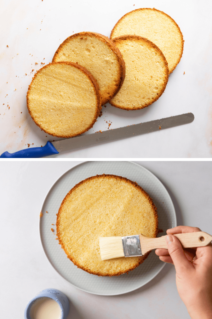 Löse die Kuchenböden, sobald sie erkaltet sind, vorsichtig aus der Form. Entferne die Backkuppel und halbiere die Böden waagerecht. Tränke sie mit etwas Milch.