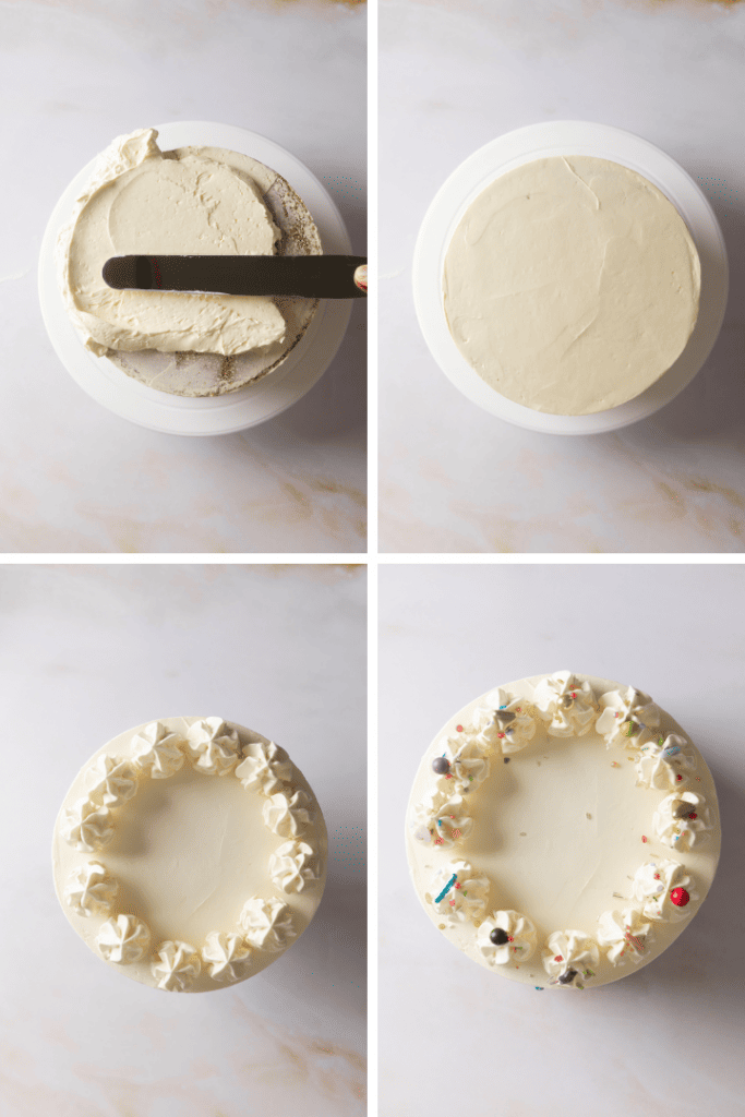 Streiche die Geburtstagstorte erneut mit Buttercreme ein und ziehe sie glatt. Dekoriere die Geburtstagstorte mit Hilfe eines Spritzbeutels mit der restlichen Buttercreme und dekoriere sie nach Herzenslust mit bunten Zuckerstreuseln.Lager die Geburtstagstorte bis zum Servieren im Kühlschrank. Nimm sie etwa 30 Minuten vor dem Servieren aus dem Kühlschrank damit die Buttercreme zart werden kann.