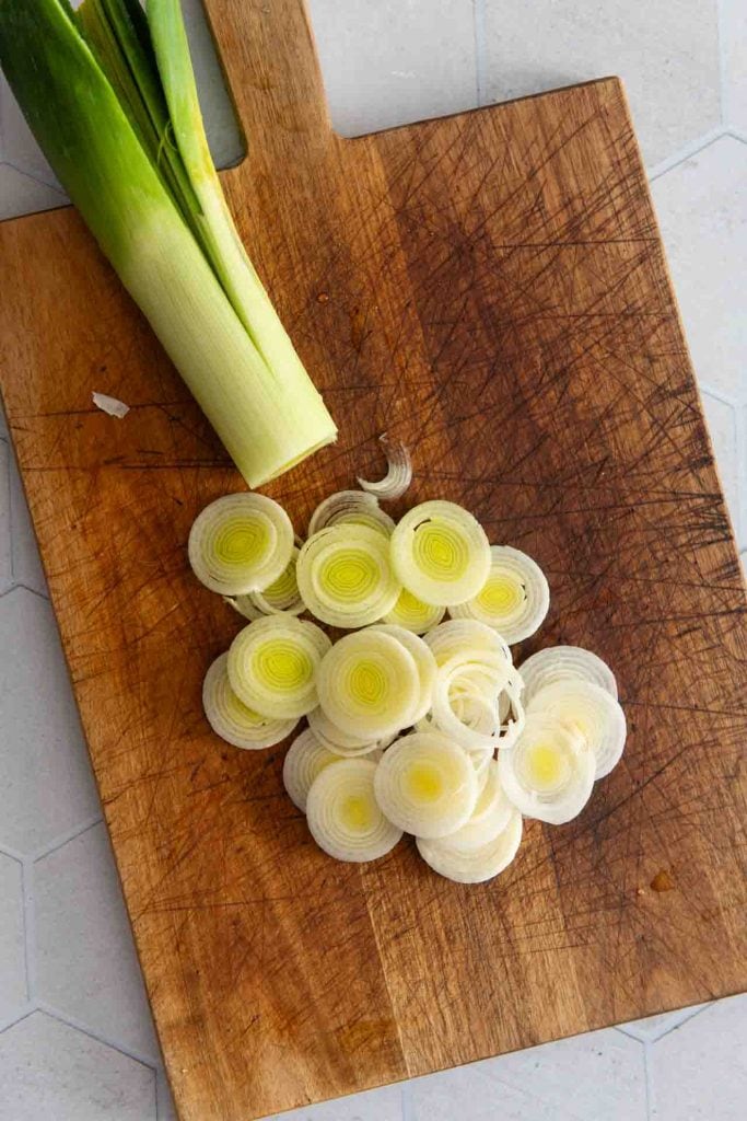 Lauch vorbereiten: Wasche und putze 3 Stangen Lauch und schneide ihn in Ringe oder Halbringe. Tipp: Im grünen Teil der äußeren Blätter versteckt sich gerne hartnäckige Erde, wasche die Stücke also unbedingt sehr gewissenhaft.