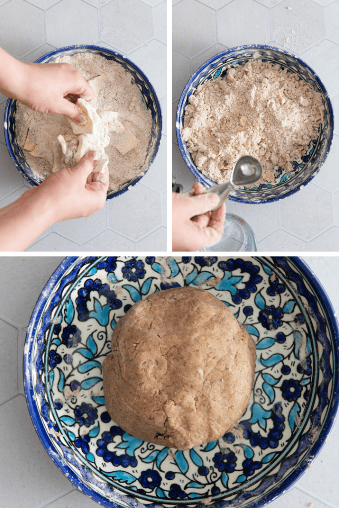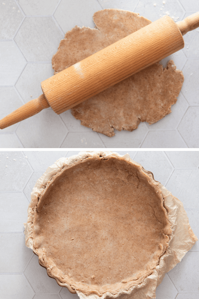 Teig zubereiten: Gib 100 g Weizenvollkornmehl zusammen mit 150 g Weizenmehl und ½ TL Salz in eine Schüssel. Füge 125 g kalte Butter (in kleine Würfel geschnitten) hinzu. Verreibe die Zutaten zügig zwischen den Fingern, bis die Butter etwas ins Mehl eingearbeitet ist und eine krümelige Struktur entsteht. Gib dann 60 ml Eiswasser dazu und vermenge die Zutaten kurz. Knete rasch einen Teig daraus. Achtung: Bitte nicht zu lange kneten, sondern wirklich nur so lang, bis sich die Zutaten verbunden haben. Wickle den Teig in etwas Frischhaltefolie oder ein Bienenwachstuch und lass ihn für 30 Minuten im Kühlschrank ruhen.