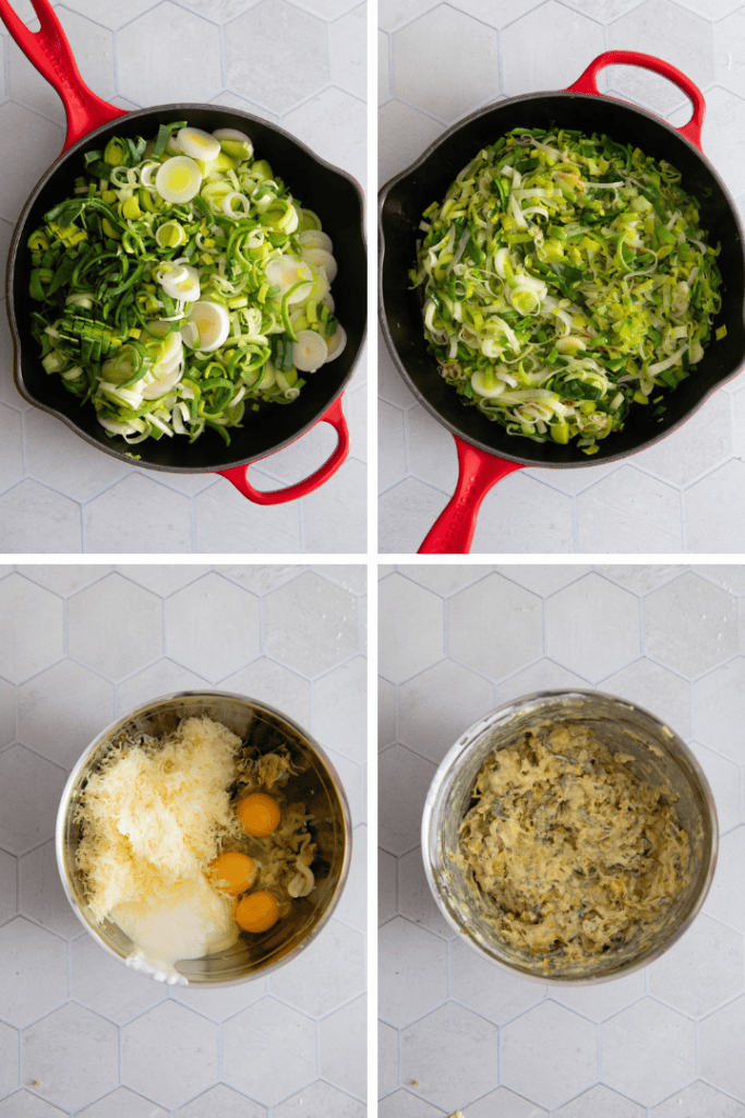 Füllung anrühren: Gib 1 EL Butter in einen Topf oder eine große Pfanne und brate den Lauch darin an, bis er zart und glasig ist. Gib den Lauch dann in eine Schüssel und lass ihn ein paar Minuten abkühlen. Vermenge ihn anschließend mit dem Saft von 1 Zitrone, ½ TL Kümmel, 3 Eier, 200 ml Sauerrahm und dem geriebenen Bergkäse. Schmecke die Füllung kräftig mit Salz und frisch gemahlener Pfeffer ab.