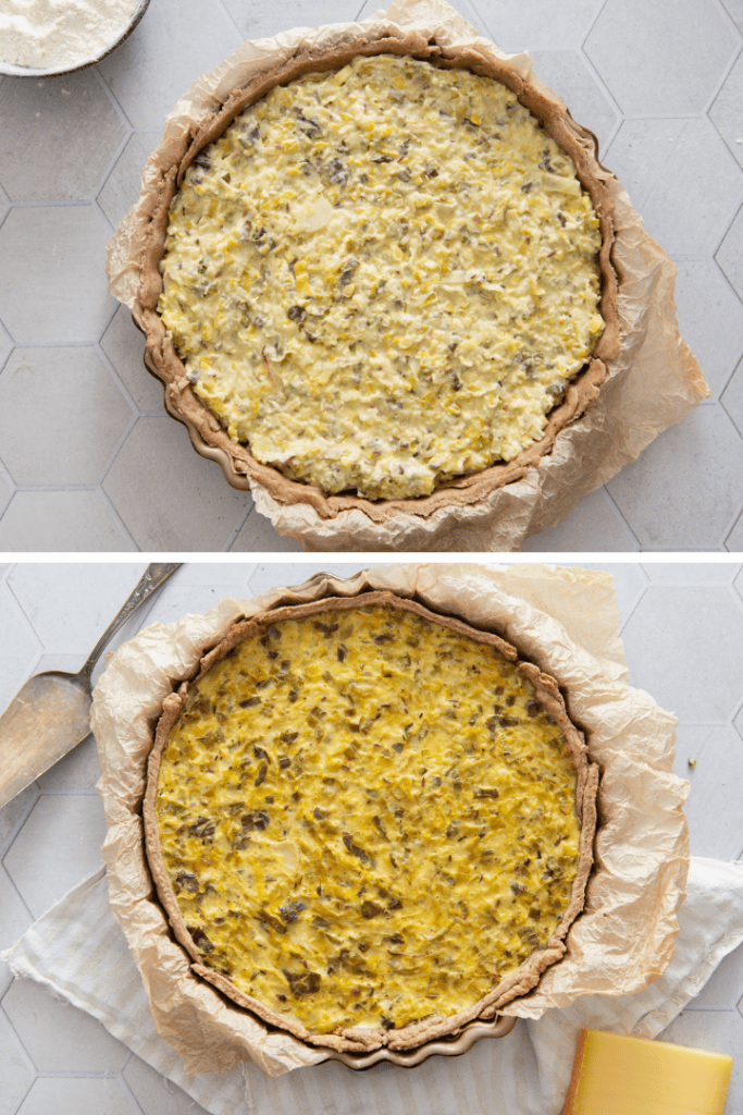 Backen & Ruhen: Gieße die Lauchfüllung auf den Teigboden und verteile sie gleichmäßig. Backe die Quiche im vorgeheizten Ofen auf der unteren Schiene für ca. 30–40 Minuten, bis das Ei komplett gestockt ist und die Oberfläche beginnt, goldbraun zu werden.