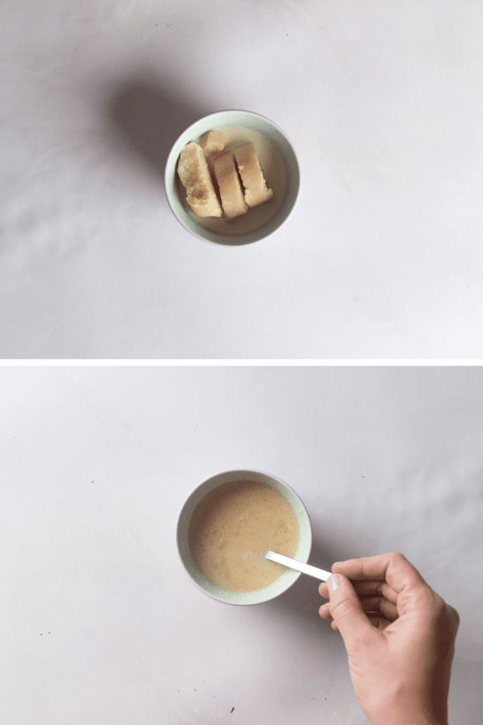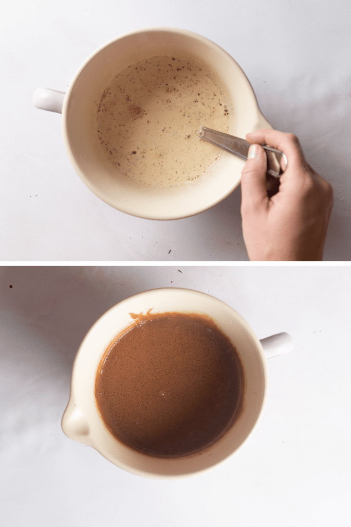 Derweil den Ofen auf 170 °C vorheizen und ein 12er Muffinblech mit Papierförmchen ausstatten. Marzipan und Milch in einen Topf geben und bei niedriger Flamme und unter ständigem Rühren erhitzen, bis sich das Marzipan aufgelöst hat. Marzipanmilch vom Herd nehmen und abkühlen lassen.
