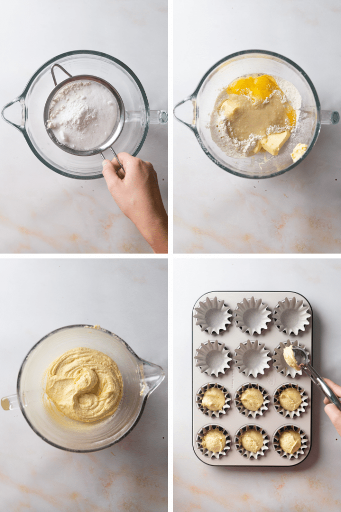 Mehl, Backpulver, Zucker und Salz in eine große Rührschüssel sieben. Butter und Eier dazu geben sowie die Marizpanmischung und das Bittermandelextrakt. Die Marzipanmilch sollte so weit abgekühlt sein, dass man den Topf problemlos ohne Topflappen anfassen kann.In der Küchenmaschine etwa 1 Minuten zu einem luftigen Teig aufschlagen. Den Teig gleichmäß auf die 12 Cupcakesförmchen aufteilen und für ca. 25 Minuten bei 170 °C backen. Mit der Stäbchenprobe prüfen, ob die Cupcakes fertig sind.