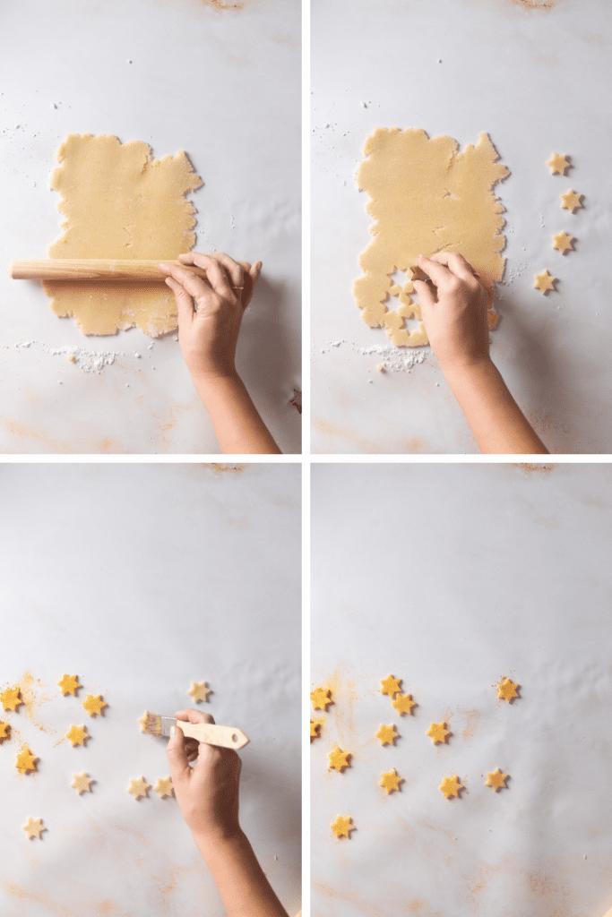 Marzipan mit einem Nudelholz ausrollen. Die Arbeitsfläche und das Nudelholz hierfür mit Puderzucker bestäuben. Kleine Sterne aus dem Marzipan ausstechen und diese mit der goldenen Lebensmittelfarbe bemalen. Hier habe ich Pulverfarbe verwendet, die mit etwas Alkohol angerührt wird.