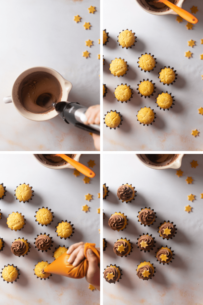 Sobald die Cupcakes vollständig abgekühlt sind und die Schokosahne richtig kalt ist, Sahne aufschlagen. Schokosahne mit einem Spritzbeutel auf die Cupcakes aufspritzen. Sterne vorsichtig auf den Cupcakes platzieren und nach Wunsch mit goldenen Zuckerstreuseln dekorieren