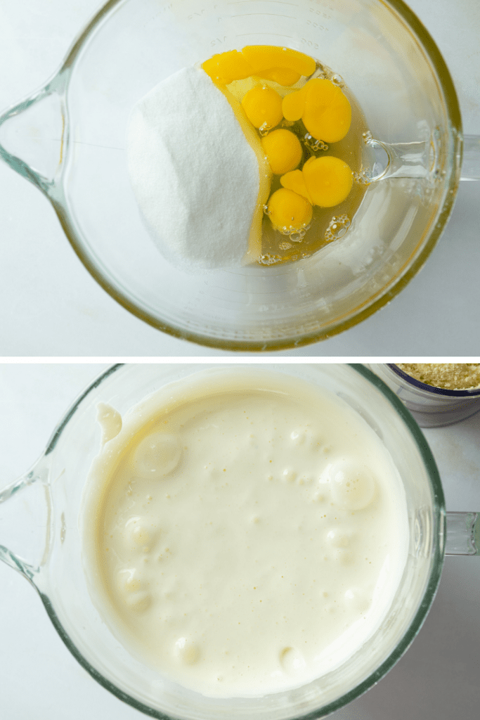 Eier in eine große Rührschüssel aufschlagen. Zucker und Salz dazugeben und in der Küchenmaschine oder mit dem Handrührgerät für etwa 10 Minuten aufschlagen, bis die Masse fast weiß und sehr cremig ist.