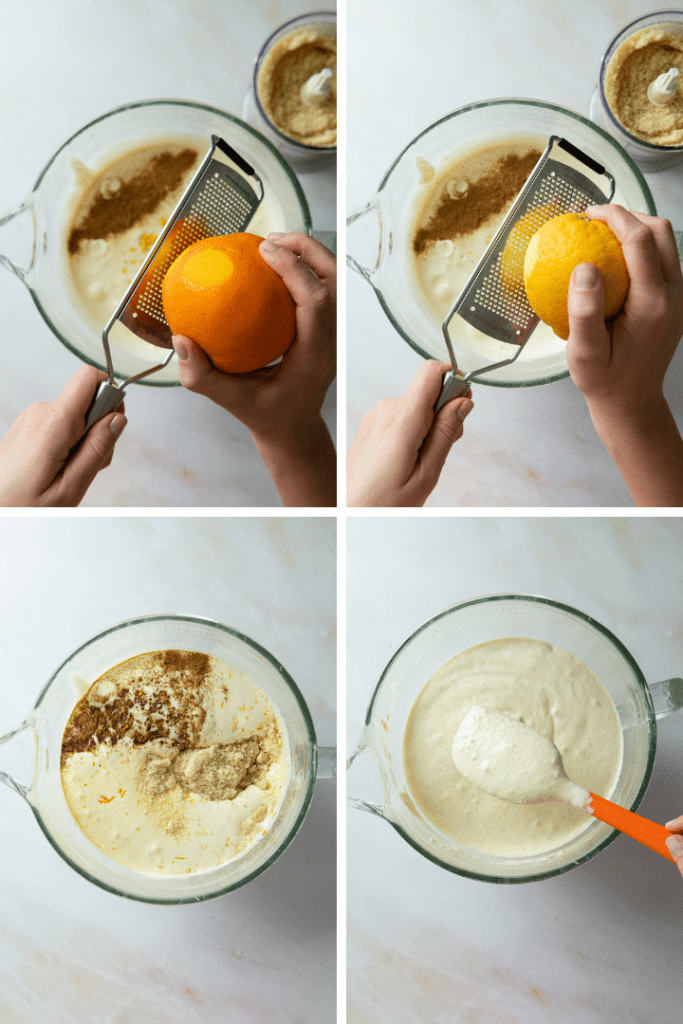 Schale der Bio Orange und Bio Zitrone abreiben und zusammen mit Zimt und gemahlenen Mandeln. Die Zutaten vorsichtig unterheben. Nicht zu viel rühren, damit keine Luft aus dem Teig geschlagen wird.