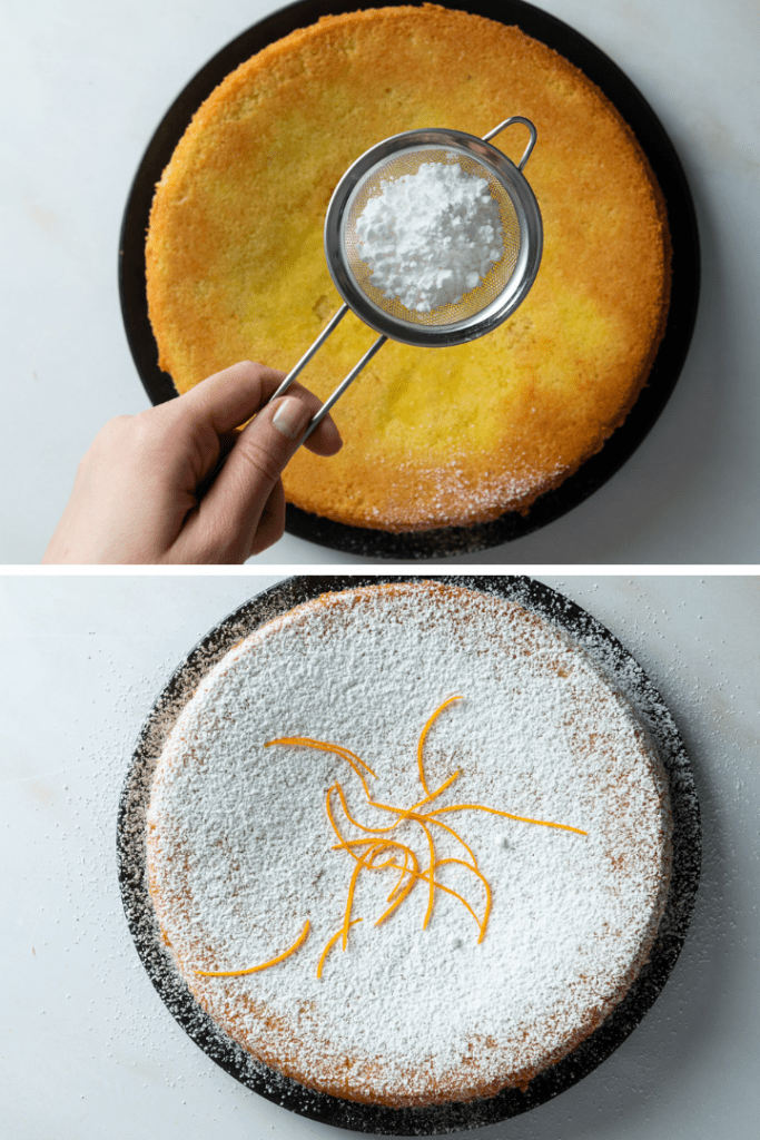 Kuchen in der Form vollständig abkühlen lassen. Dann vorsichtig aus der Form lösen, auf eine Tortenplatte setzen und mit Puderzucker bestäuben.