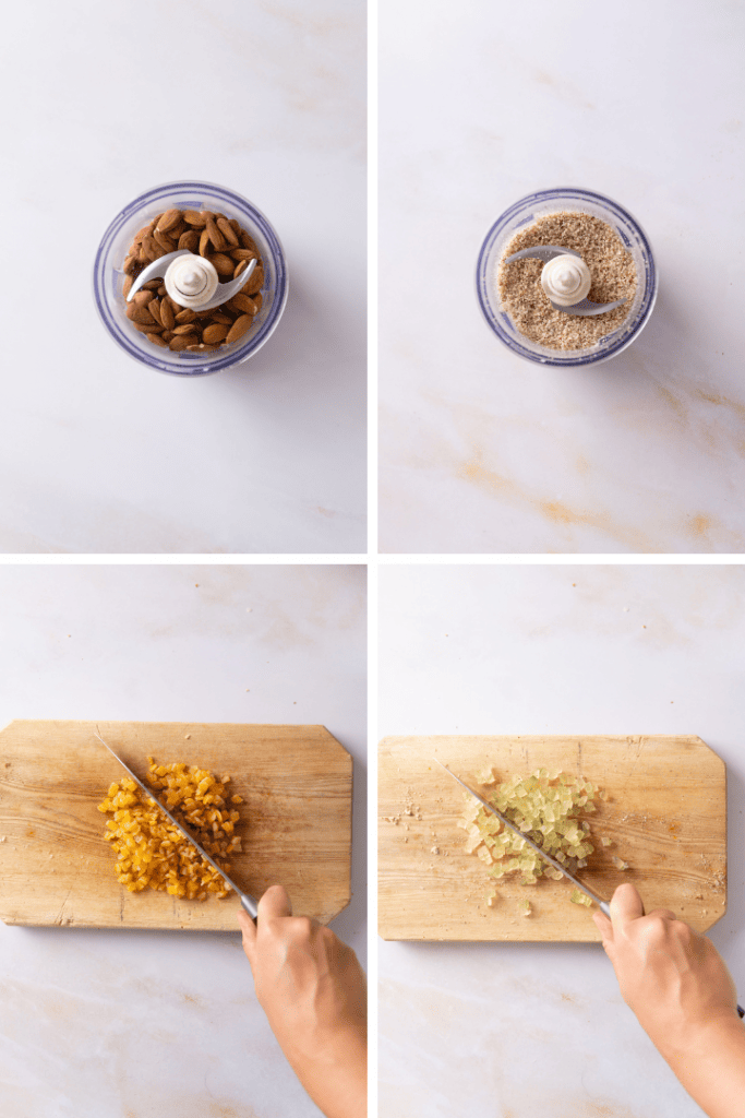 Haselnüsse und Mandeln zusammen in einer Pfanne ohne Öl kurz rösten. Dabei regelmäßig schwenken, damit sie nicht anbrennen. Haselnüsse und Mandeln anschließend mit einem Mixer oder einem Food Processor fein mahlen. Kurz zur Seite stellen. Hacke Orangeat und Zitronat sehr fein und stelle es ebenfalls kurz zur Seite.