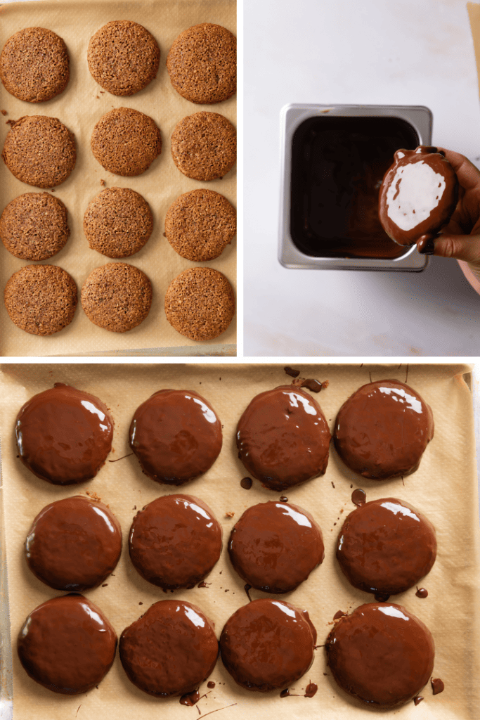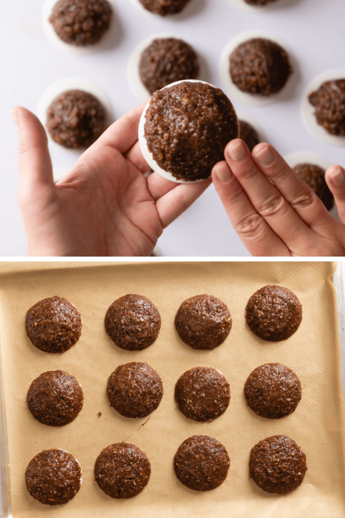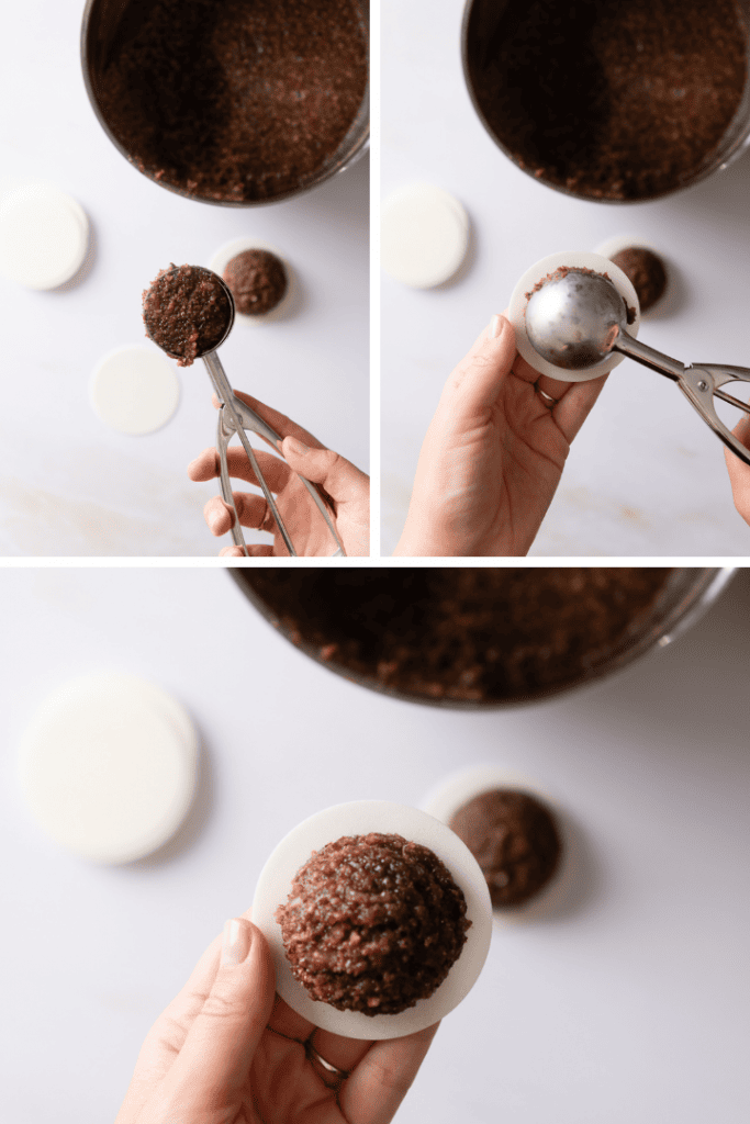Am nächsten Tag Backofen auf 170 °C Ober- und Unterhitze vorheizen. Oblaten und Backbleche vorbereiten. Vom Teig dann mit einem Eisportionierer oder zwei Teelöffeln eine Portion abstechen und jeweils auf die Oblate setzen. Die benötigte Teigmasse ist etwas größer als ein Golfball.