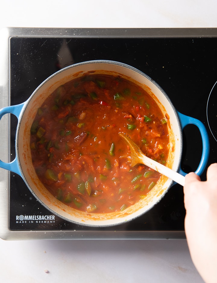 Rauchpaprika, Kreuzkümmel und Zucker dazugeben und kurz mit anbraten lassen. Dann die Dosentomaten dazu geben. Kräftig unterrühren. Die Salsa Sauce etwa 10 Minuten köcheln lassen. Dabei gelegentlich umrühren.