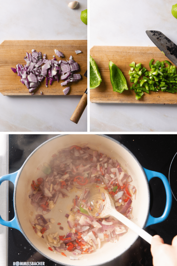 Zwiebel, Knoblauch und Chilischote fein hacken. Die Paprika waschen, von Strunk befreien und in etwa 1 cm große Würfel schneiden. Pflanzenöl in einem Topf erhitzen und Zwiebeln, Knoblauch und Chili darin glasig dünsten.