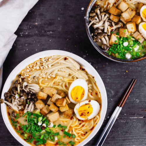 Je 1 TL Misopaste, 1 TL Chiliöl und 2 EL Hafermilch in jeweils eine große Suppenschüssel geben. Mit etwas Brühe aufgießen und mit einem Schneebesen Chiliöl, Hafermilch, Misopaste und Brühe vermischen, dann die restliche Brühe gleichmäßig auf die beiden Schüsseln verteilen. Die gegarten Nudeln hinein legen. Pilze gleichmäßig aufteilen. Eier schälen, halbieren und ebenfalls zur Suppe geben. Frühlingszwiebeln gleichmäßig auf beide Schüsseln aufteilen.