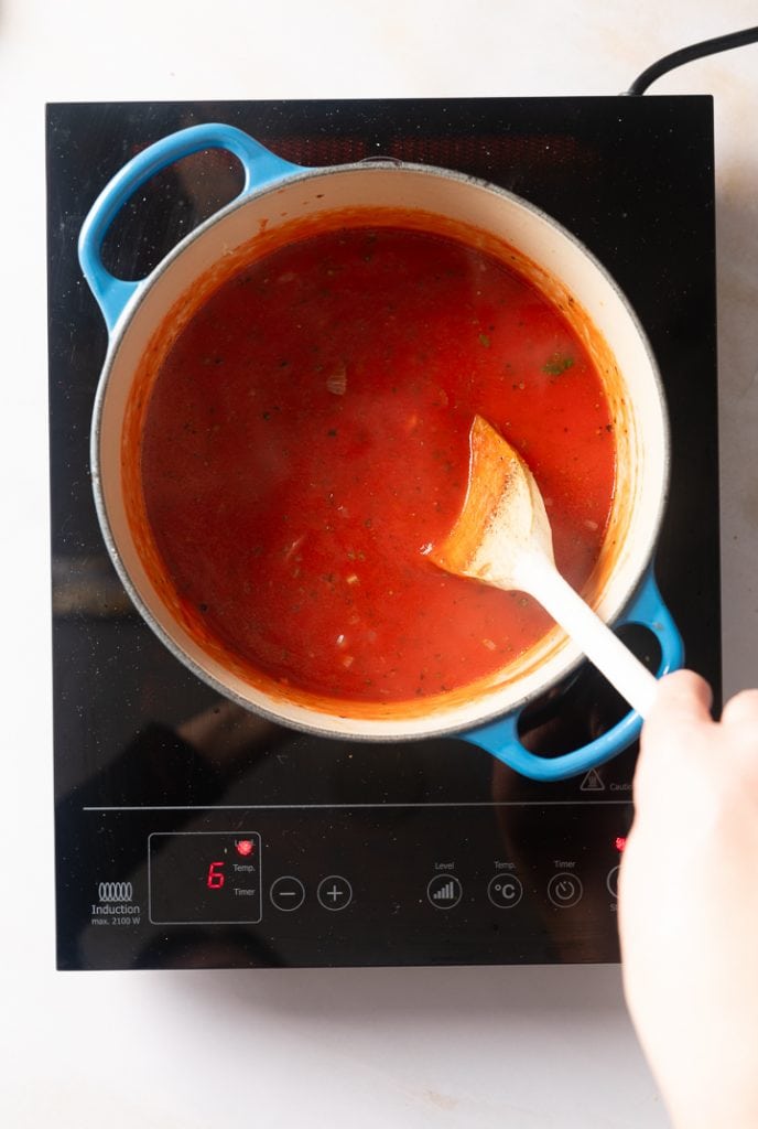 Lass die Tomatensoße für etwa 10 Minuten köcheln. Schmecke sie mit Zucker, Salz und Pfeffer ab und serviere sie nach Herzenslust zu frisch gekochter Pasta.
