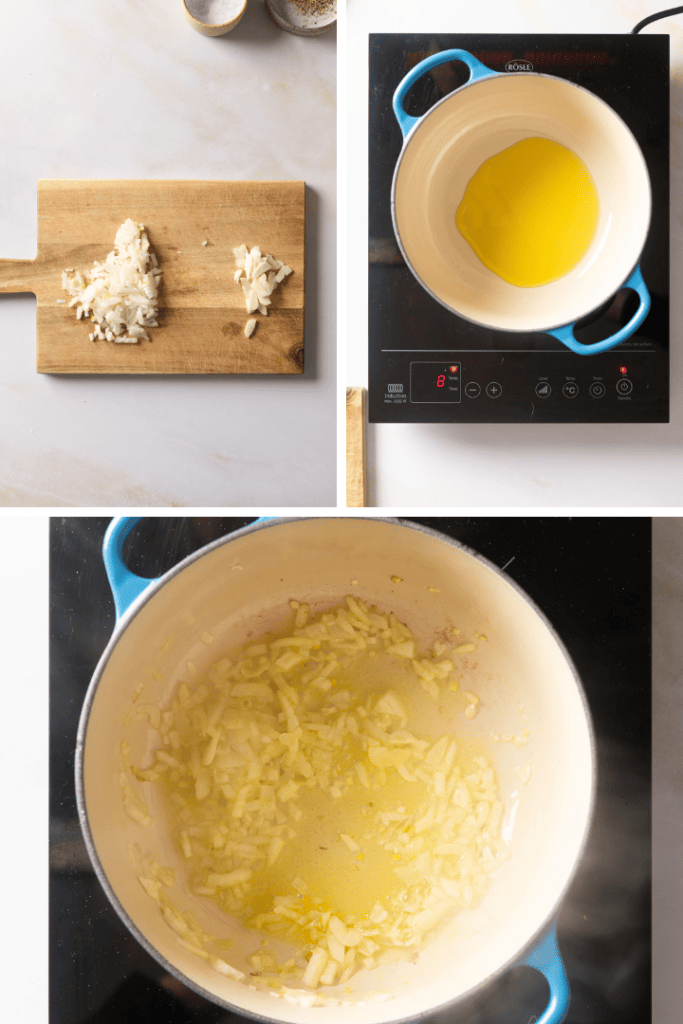 Hacke Zwiebel und Knoblauch sehr fein. Erhitze Olivenöl in einem Topf und brate Zwiebel und Knoblauch darin ab.