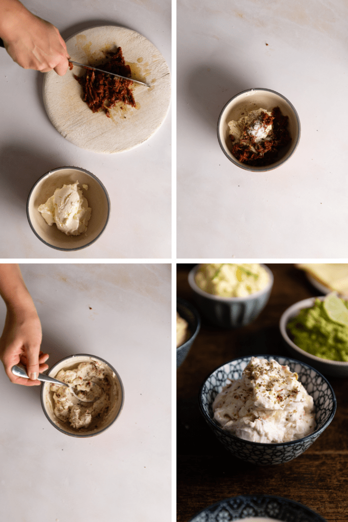 Getrocknete Tomaten fein hacken. Mit Frischkäse und Oregano vermengen, Dip mit Salz und Pfeffer abschmecken. Wer mag, gibt etwas Chili dazu.