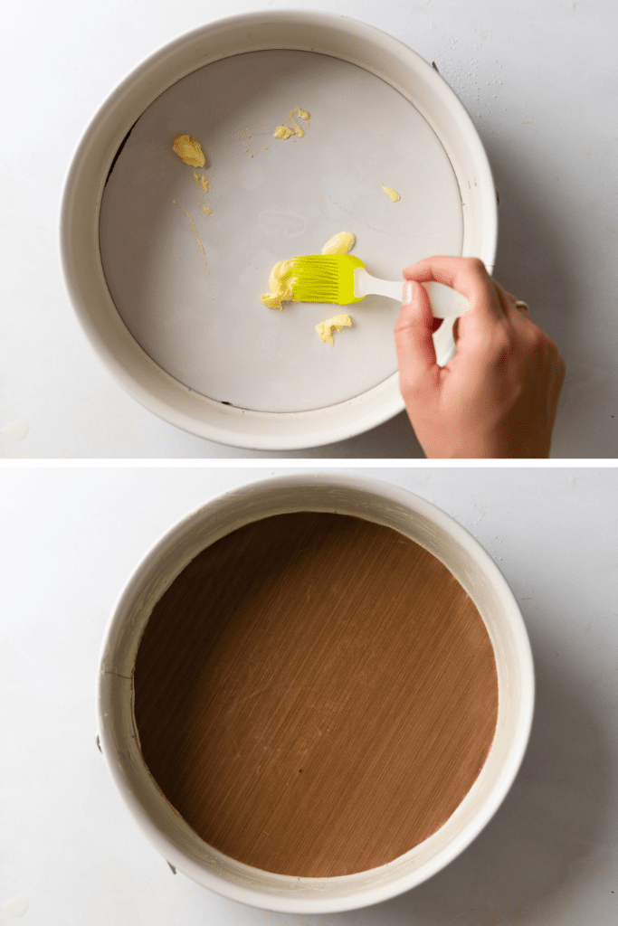 Backofen auf 170 °C Ober- und Unterhitze vorheizen. Eine Springform mit 26 cm Durchmesser mit Butter bestreichen und den Boden mit Backpapier belegen.