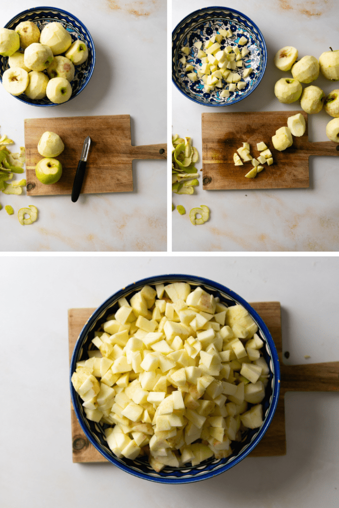 Zunächst Äpfel für die Füllung waschen, schälen und entkernen. Dann in ca. 1 cm große Würfel schneiden. In eine Schüssel geben.