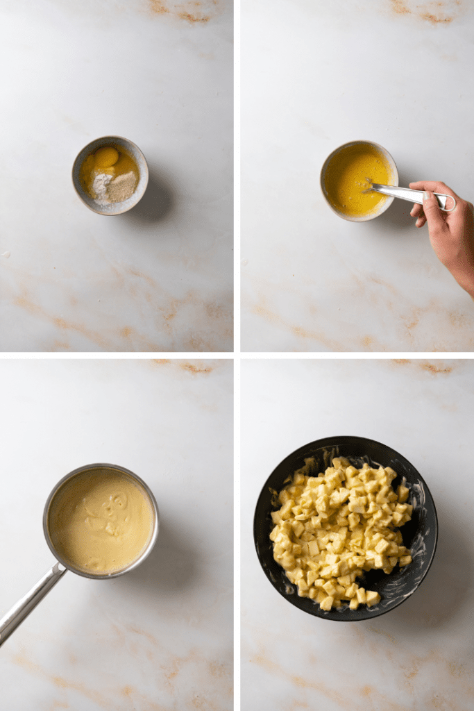 Für den Pudding die Milch zum kochen bringen. In einer Schüssel Ei, Vanillepuddingpulver, Zucker und Salz vermengen. Sobald die Milch kocht, Schluckweise zur Eimasse geben, um diese zu temperieren. Dann die Masse zurück in den Topf geben und unter Rühren bei kleiner Hitze eindicken lassen. Pudding dann mit den Apfelstücken vermengen. Kurz zur Seite stellen.