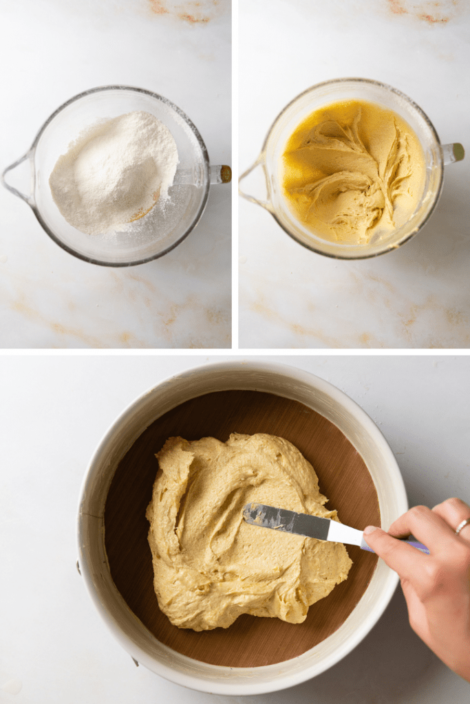 Für den Teig alle Zutaten in eine große Rührschüssel geben und für etwa 1 Minuten in der Küchenmaschine oder mit dem Handrührgerät zu einem luftigen Teig aufschlagen. Teig dann in die vorbereitete Backform füllen und glatt streichen.