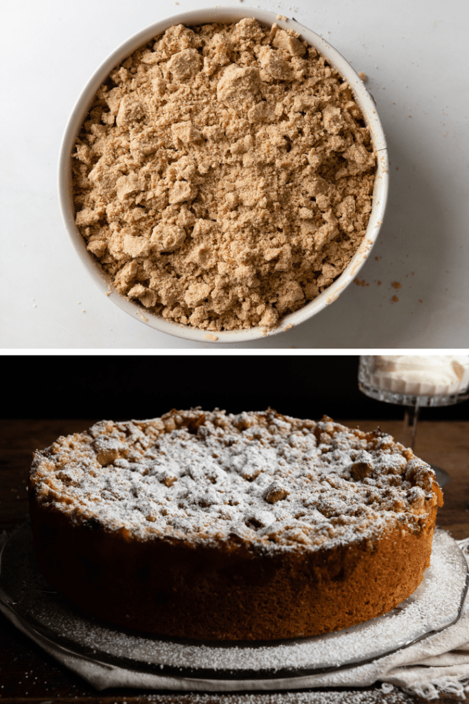 Kuchen im vorgeheizten Backofen bei 170 °C Ober- und Unterhitze für ca. 70 Minuten backen, bis die Streusel goldbraun gebacken sind. Komplett abkühlen lassen und vor dem Servieren mit etwas Puderzucker bestäuben.