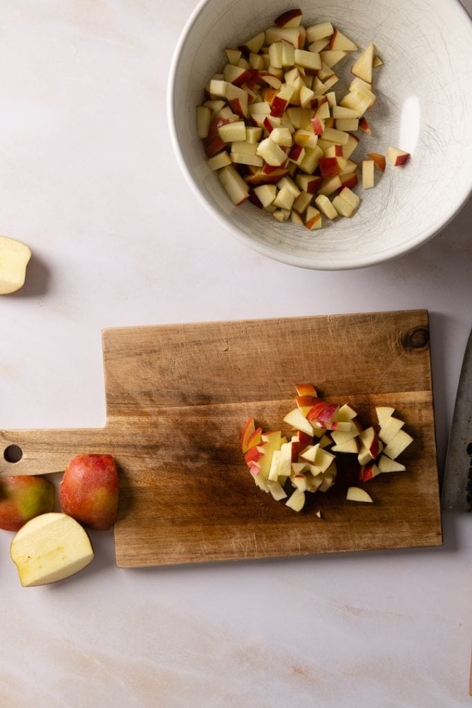 Backofen auf 170 °C Ober- und Unterhitze vorheizen. Ein Backblech mit Backpapier auslegen. Äpfel waschen, vierteln und das Kernhaus entfernen. In etwa 1 cm große Würfel schneiden.