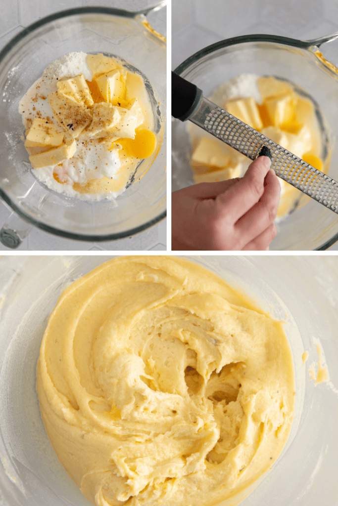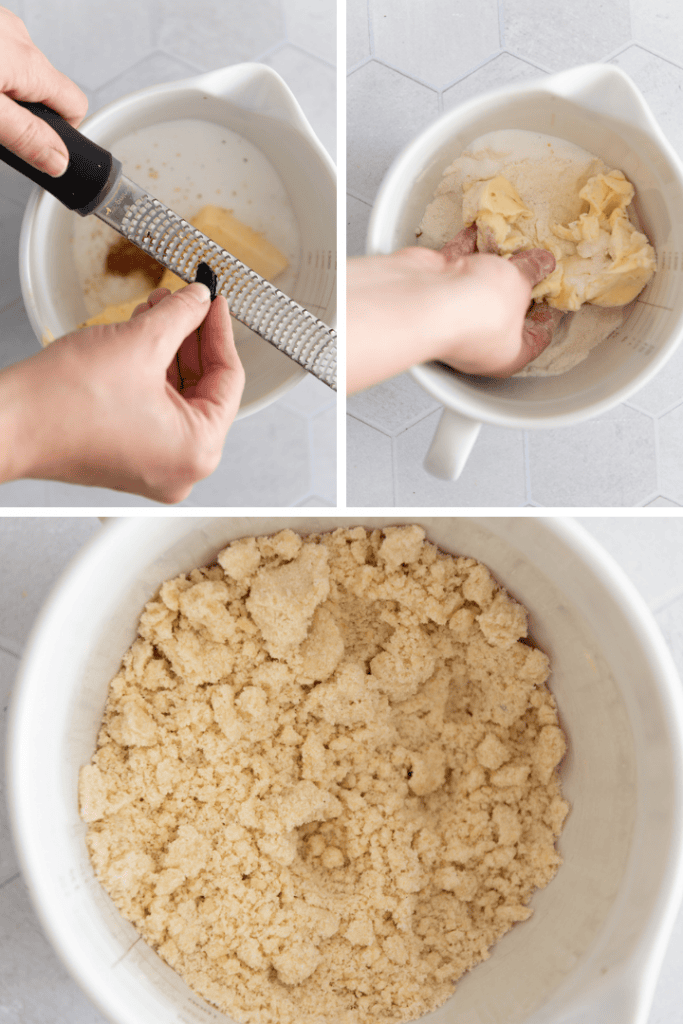 Für den Teig 190 g Butter in eine Rührschüssel geben. 190 g Zucker, 190 g Weizenmehl und 7 g Backpulver dazu sieben. 3 Eier, 1 Prise Salz und 1 Prise Tonkabohne (alternativ Vanillezucker) mit in den Teig geben.