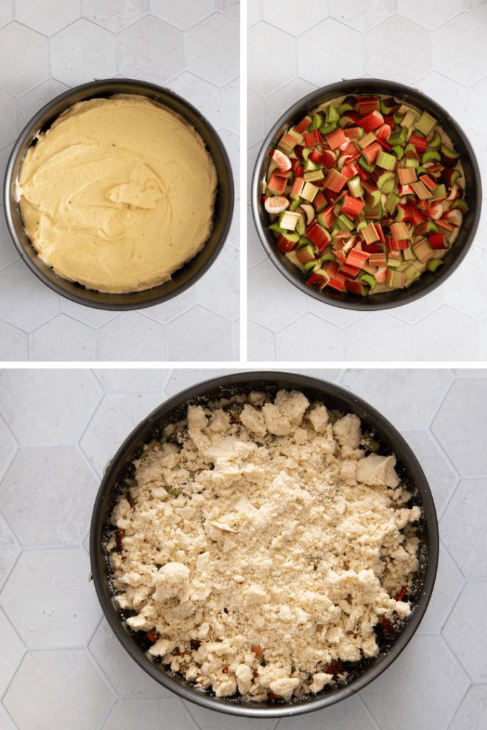 Teig in die vorbereitete Backform geben. Rhabarber auf dem Teig verteilen und die Streusel darüber verteilen.