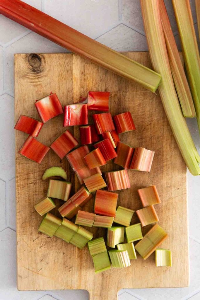 1 kg Rhabarber waschen und putzen. Dafür das Stielende und den Blattansatz entfernen. Rhabarber in ca. 1 cm große Stücke schneiden.