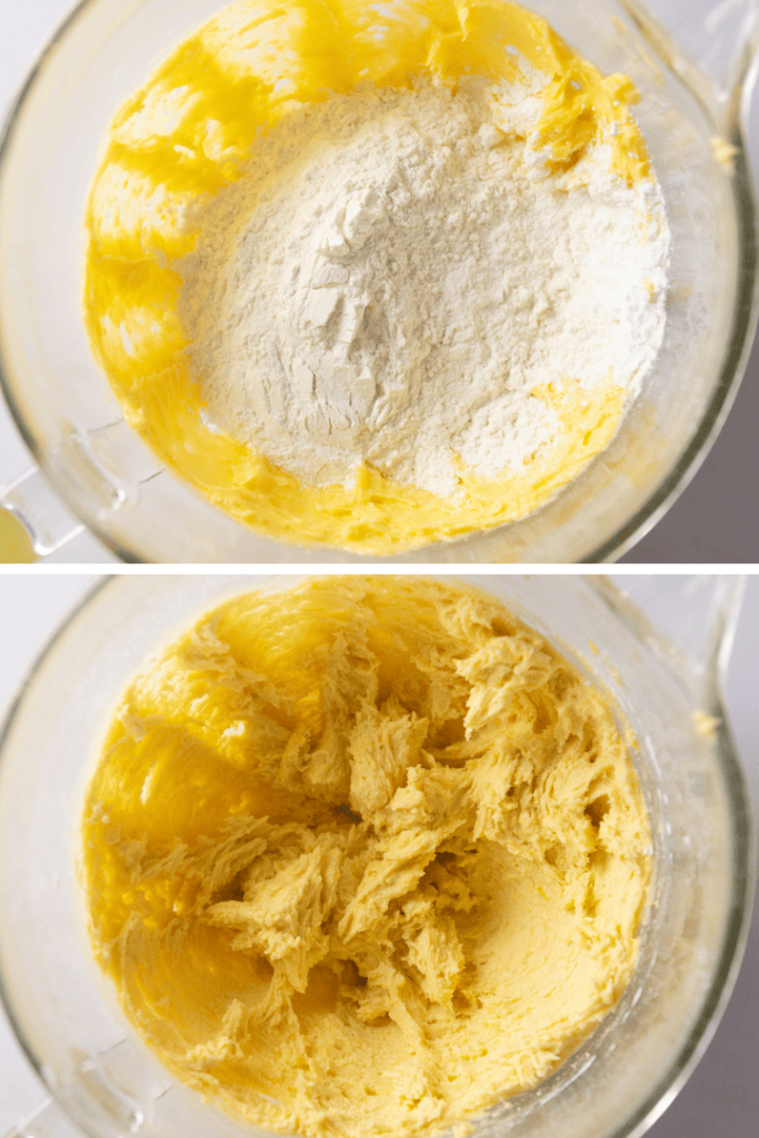 Gib Weizenmehl, Backpulver und Speisestärke dazu und vermenge alle zu einem glatten Teig.