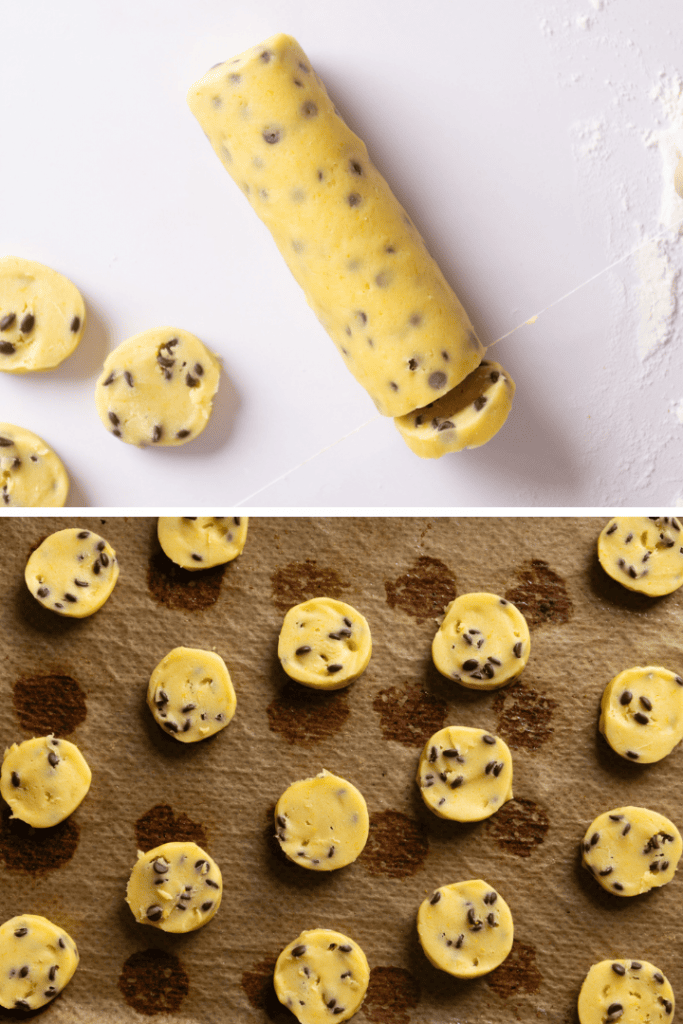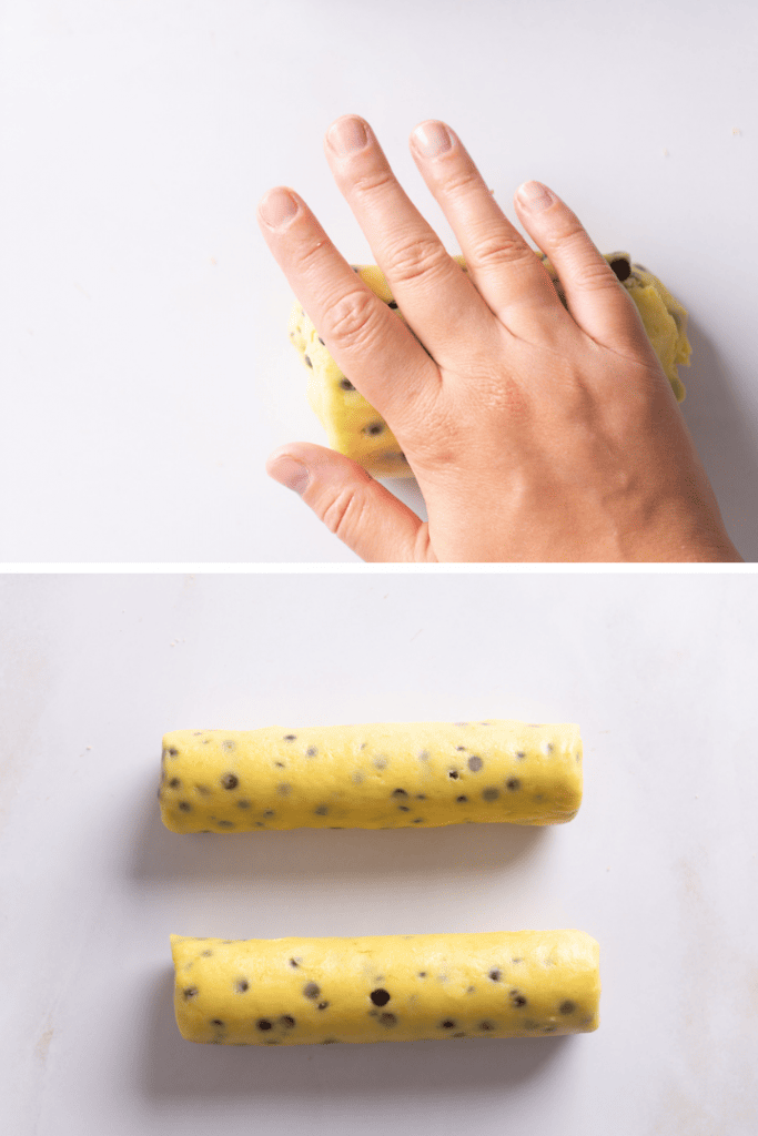 Forme den Teig zu zwei Teigsträngen mit etwa 4-5 cm Durchmesser. Kühle diese Teigstränge für 30-60 Minuten.