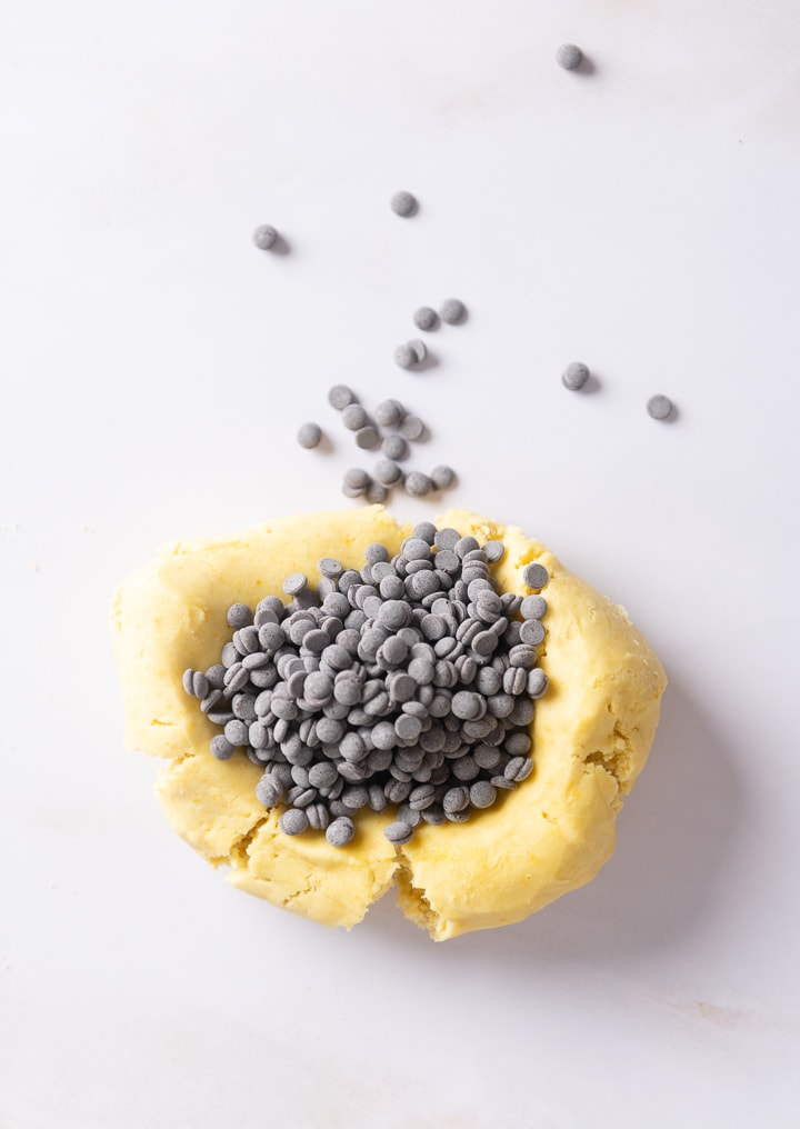 Gib den Teig auf die Arbeitsfläche und knete die Schokochips oder die gehackte Schokolade hinein. Kühle den Teig für mindestens 1 Stunde, besser über Nacht.