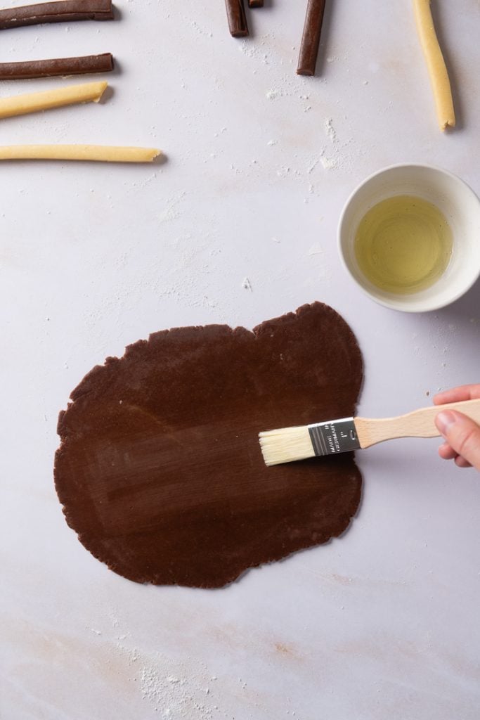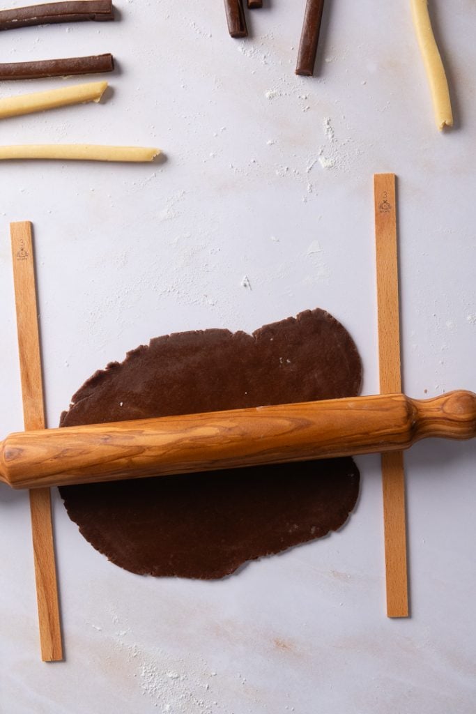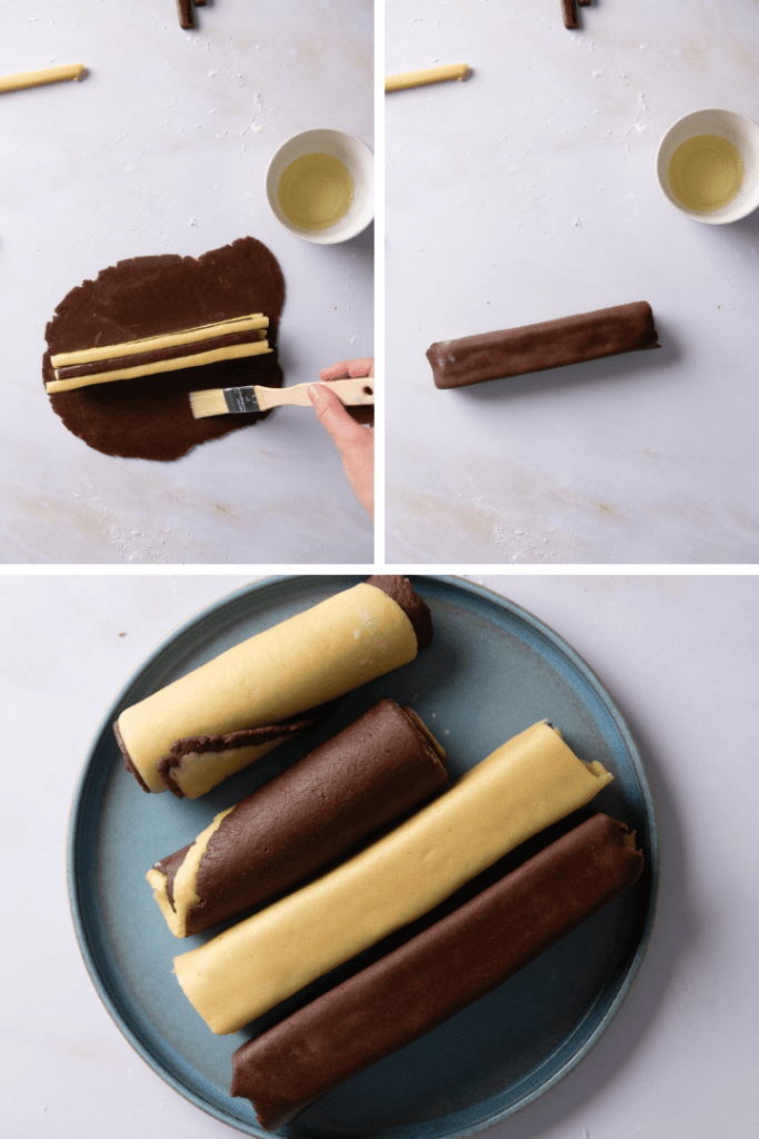 Halbiere den Teig und rolle eine Hälfte so auf, dass der weiße Teig außen ist, die andere sodass der schwarze Teig außen ist. Kühle auch diese beiden Teigstränge für mindestens 1 Stunde.
