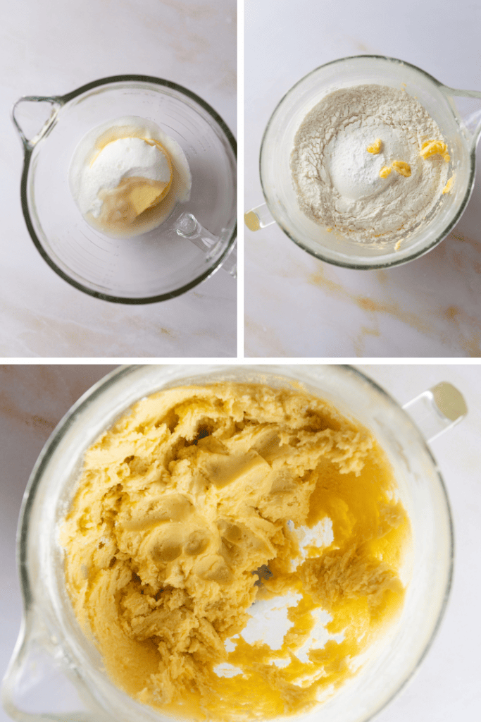 Vermenge Butter, Zucker, Vanilleextrakt und Salz kurz in einer großen Rührschüssel. Rühre dann die Eier unter. Gib Weizenmehl und Backpulver dazu und vermenge alle Zutaten zu einem glatten Teig.