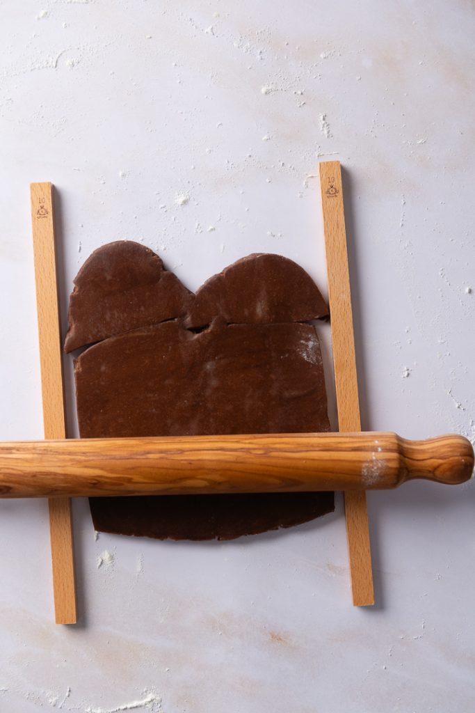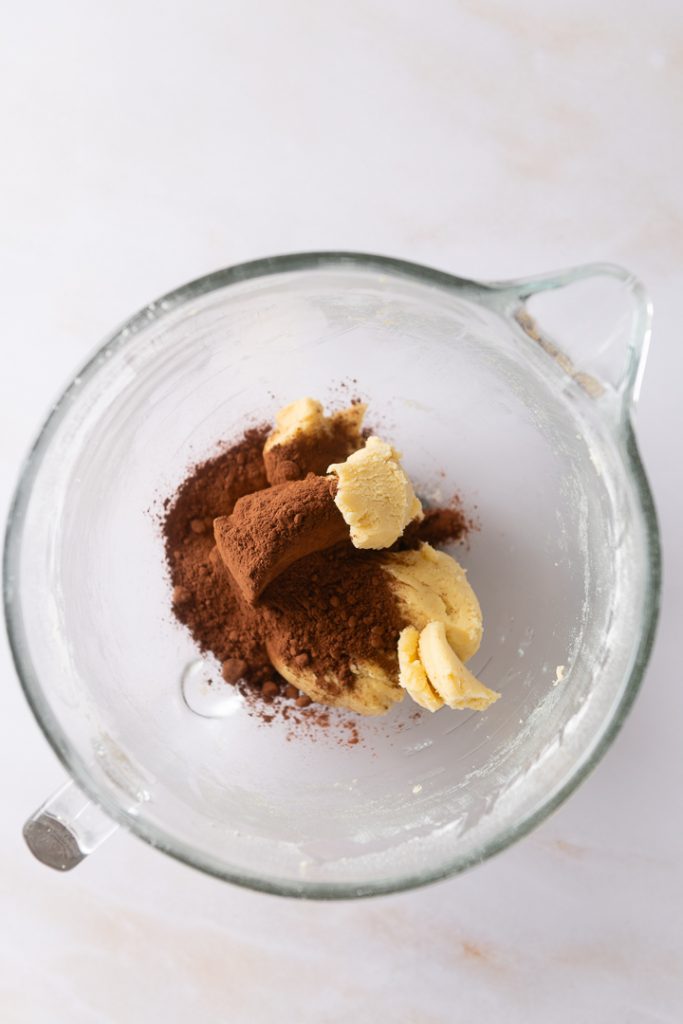 Nimm die Hälfte des Teiges aus der Schüssel und rolle ihn zu einer Kugel. Füge zum restlichen Teig den Backkakao hinzu und knete ihn unter. Forme auch den schwarzen Teig zu einer Kugel, wickle beide Teige separat in Folie oder ein Bienenwachstuch und kühle sie für mindestens 1 Stunde, besser über Nacht im Kühlschrank.