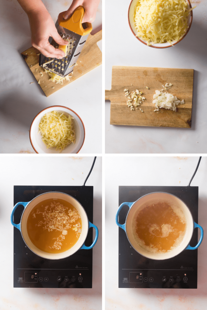 Käse grob raspeln. Knoblauchzehe und Zwiebel sehr fein hacken. In einem mittelgroßen Topf den Apfelsaft erwärmen. Knoblauch und Zwiebel dazugeben und 1 Minute sprudelnd aufkochen lassen.