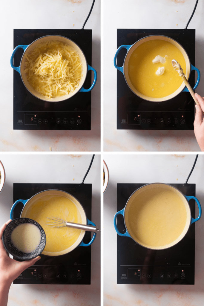 Nun den geriebenen Käse dazugeben und unter ständigem Rühren schmelzen lassen. Wenn der Käse beginnt zu schmelzen, die Creme Fraiche dazugeben und unterrühren. Speisestärke mit Zitronensaft anrühren. Sobald der Käse geschmolzen ist, die Speisestärke-Mischung dazugeben und zu einer cremigen Masse verrühren. Hinweis: Bevor die Speisestärke mit im Käsefondue ist, kann es so wirken, als würden sich Flüssigkeit und Käse nicht richtig verbinden. Durch Stärke und Säure entsteht dann aber ein cremiges Fondue. Wichtig ist, die richtige Temperatur zu erreichen, bei der das Fondue ideal cremig ist.
