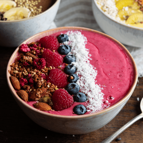 Die fertig gemixte Smoothie Bowl wird dann in eine Müslischale gefüllt und nach Herzenslust mit Beeren, Früchten, Granola, Nüssen, Haferflocken und Saaten dekoriert und direkt serviert.