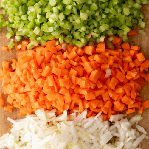 Schneide 200 g Sellerie, 200 g Karotten und 200 g Zwiebeln in sehr kleine und einheitlich große Würfel. Erwärme 2 EL Olivenöl in einem Topf und brate das Gemüse darin an bis es glasig ist. Verwende es dann weiter als Basis für italienische Saucen, Suppen und Co.
