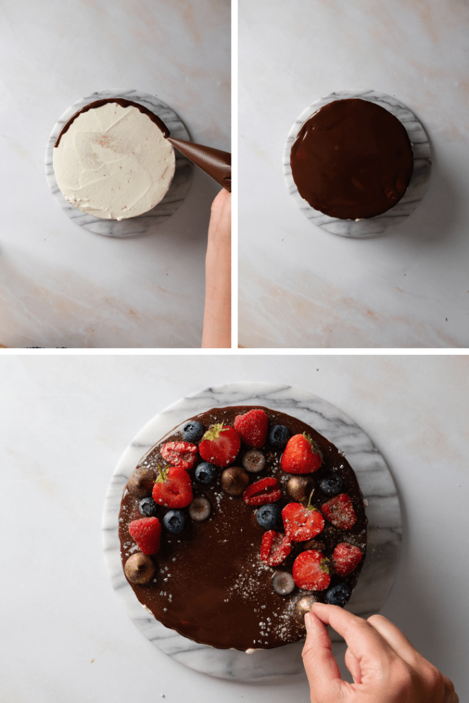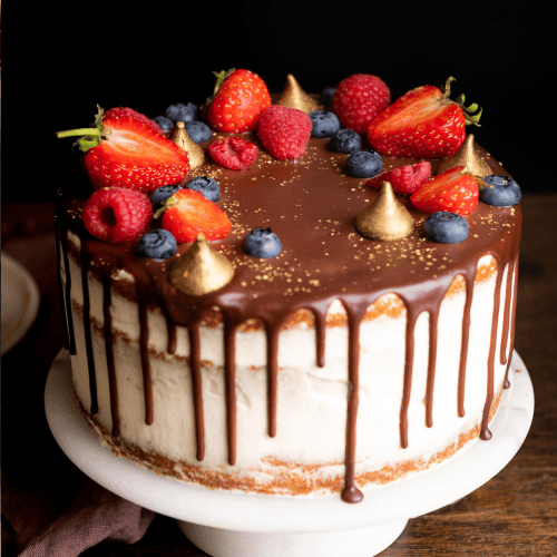 Die Ganache dann in einen Spritzbeutel umfüllen, damit lässt sich der Drip Cake am Besten garnieren. Eine kleine Spitze abschneiden und am Rand der Torte entlang einen gleichmäßigen Schokodrip auftragen. Dann etwas Ganache in die Mitte der Torte geben und glatt streichen. Nun die Torte mit frischen Beeren, Schokodekoration und goldenen Zuckerstreuseln dekorieren. Bis zum Servieren im Kühlschrank lagern.