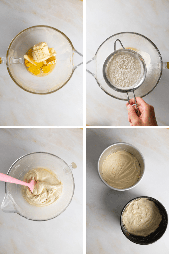 Butter, Zucker, Vanilleextrakt und Eier in eine große Rührschüssel geben. Mehl und Backpulver dazu sieben und Salz dazu geben. Mit der Küchenmaschine oder dem Handrührgerät zu einem luftigen Teig aufschlagen. Das dauert ca. eine Minute. Teig dann gleichmäßig auf die vorbereiteten Backformen aufteilen. Glatt streichen und bei 170 °C Ober- und Unterhitze für 40 Minuten backen bis die Kuchenböden goldbraun gebacken sind. Mit der Stäbchenprobe den Garpunkt prüfen. Was ist die Stäbchenprobe? Piekse zum Ende der Garzeit einen Zahnstocher oder Schaschlikspieß in die Mitte des Kuchens. Kleben keine Krümel oder flüssiger Kuchenteig mehr daran, ist der Kuchen fertig gebacken und darf aus dem Ofen genommen werden. Befinden sich Teig oder Krümel am Stäbchen muss der Kuchen noch einige Minuten länger backen.